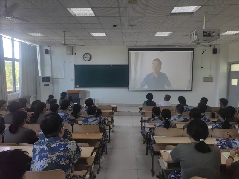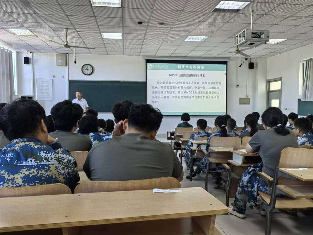 李军以“医学新生  梦想与担当同行”为题,围绕学院历史、特色和优势等方面展开叙述。一是学院简介方面,向同学们介绍了住院手术例数、人才队伍建设和重症医学科等国家级项目;二是学院发展方面,以引入NOSES手术与达芬奇机器人结合等为例介绍医院的新技术和新突破;三是教育教学方面,通过购置先进仪器设备、开通24小时医学频道和建立特色“三导师制”为教育教学提供有力保障;四是新生寄语:医学之路,道阻且长,个人的成长需要付出大量的时间和精力,鼓励同学们为成为一名优秀的医学人才而不懈奋斗。
