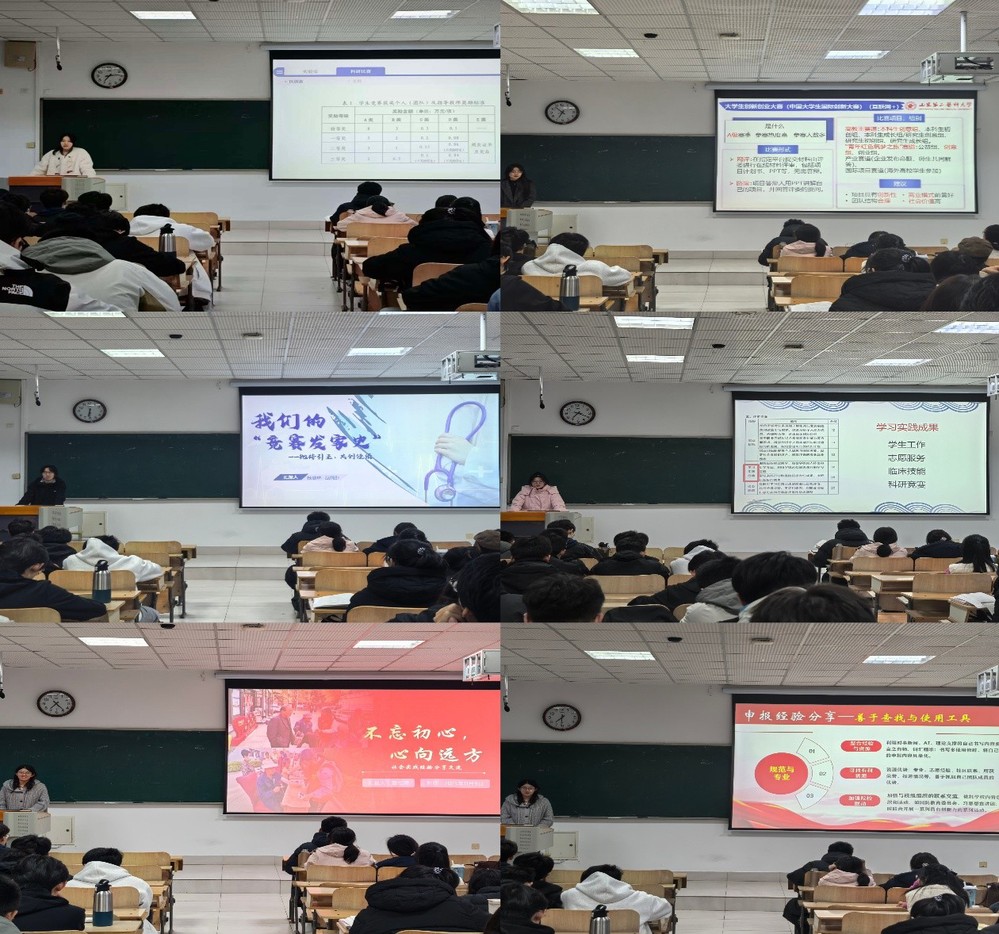 经验交流会上,杨慧琳系统介绍各类与医学生息息相关的专业竞赛,同时聚焦全国大学生生命科学竞赛、“挑战杯”等赛事,详细分享了比赛流程、时间安排,以及研究综述撰写、实验设计、演讲答辩的实用技巧。赵靖彤同学结合自身经历,给出大学生创新创业训练计划项目的准备建议,拆解了“三创赛”的自我认知要点,并细致讲解全国大学生基础医学创新研究暨实验设计论坛PPT制作技巧。高萌围绕课题组选择、入组必备能力展开分享,结合医创赛、生科赛的参赛经历,拆解答辩环节的准备重点。李家馨针对大学生职业规划大赛成长赛道,清晰梳理了所需材料、参赛切入点,以及实践成果展示与评审标准。邵明霞注重英语学习与科研能力的协同提升,分享兼具实用性与指导性的双重技巧,内容涵盖高效英语学习方法、高水平英语赛事备赛攻略,详细拆解助研机会的获取路径,鼓励同学们打破局限、勇敢尝试,在实践中实现双向成长。查桂荣带来社会实践领域的经验分享,结合组织“返家乡”活动的经历,谈到沟通与耐心是实践活动顺利推进的关键,同时分享社会实践申报的小窍门——善于查找和运用各类工具。