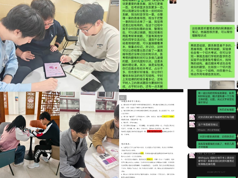 在具体实施中,学院依托帮扶记录表,建立数十组“一对一”或“一对多”的结对机制。2024级朋辈导师根据新生的课程难点与个人需求,量身定制帮扶方案。做法上突出“三步走”:一是资料共享,通过微信群分章节推送系统解剖学、组织胚胎学等课程的课件、笔记和案例教学资料,形成云端资源库;二是方法指导,结合自身备考经验,帮助新生梳理知识框架、优化复习策略、调整考前心态;三是难点攻坚,定期开展线下小范围答疑和重点知识串讲,针对脉管系统、神经系统等抽象章节进行面对面拆解讲解。此外,朋辈导师建立周反馈机制,及时了解新生的掌握情况,动态调整帮扶重点,确保帮扶过程扎实、内容实用。